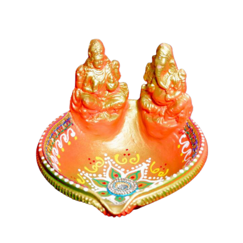 Embrace the essence of prosperity and wisdom with our Fancy Diwali Laxmi Ganpati Akhand Diya. Intricately sculpted, the diya displays the revered figures of Laxmi and Ganpati, both symbolic of blessings and good fortune. The golden-orange hue complements the detailed artistry, while the vibrant border embellished with radiant patterns adds a touch of grandeur. A must-have for your festive decor, this diya not only illuminates your space but also brings forth a sense of reverence and devotion.