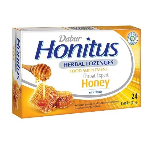 Soothe and calm your throat with Dabur Honitus Herbal Honey Lozenges, which are packed with natural ingredients like honey, turmeric, ginger, licorice, and amla. These delicious lozenges effectively relieve sore throats and coughs, reducing inflammation and promoting healing. Their pleasant flavour and convenient packaging make them the perfect remedy to carry on the go.