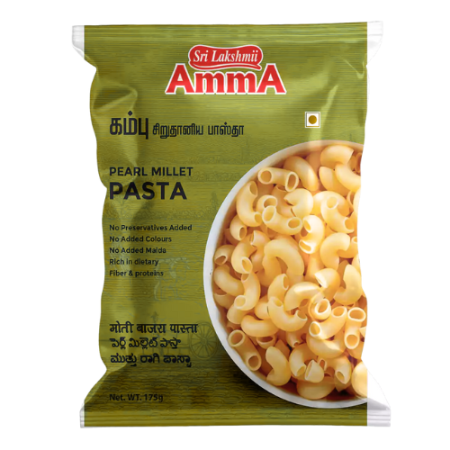 Amma Pearl Millet Pasta is a type of pasta made from pearl millet flour, a nutritious grain that is high in fibre, protein, and essential minerals like iron and magnesium. Pearl millet is a staple food in many countries and is known for its versatility and nutritional value. The Amma Pearl Millet Pasta is made with 100% pure pearl millet flour, making it a healthy and tasty alternative to traditional pasta made from wheat flour. The pasta has a slightly nutty and sweet flavour and is available in a variety of shapes and sizes to suit any recipe. Whether it's served with a simple tomato sauce or in a hearty soup, Amma Pearl Millet Pasta is a delicious and nutritious way to enjoy the classic taste of pasta.