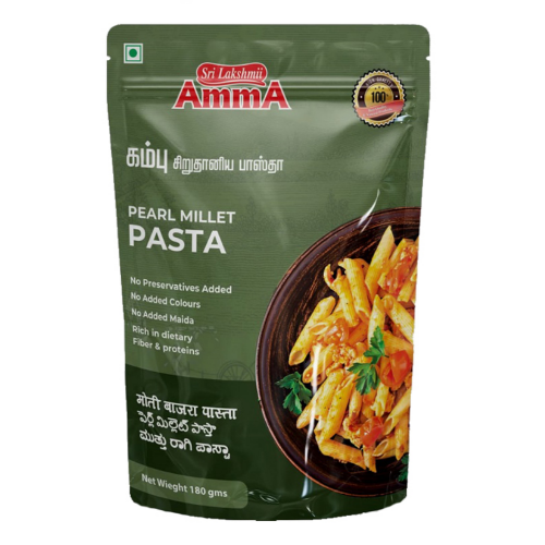 Amma Pearl Millet Pasta is a type of pasta made from pearl millet flour, a nutritious grain that is high in fibre, protein, and essential minerals like iron and magnesium. Pearl millet is a staple food in many countries and is known for its versatility and nutritional value. The Amma Pearl Millet Pasta is made with 100% pure pearl millet flour, making it a healthy and tasty alternative to traditional pasta made from wheat flour. The pasta has a slightly nutty and sweet flavour and is available in a variety of shapes and sizes to suit any recipe. Whether it's served with a simple tomato sauce or in a hearty soup, Amma Pearl Millet Pasta is a delicious and nutritious way to enjoy the classic taste of pasta.