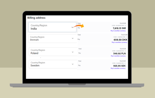After selecting 'Pay in any currency' and proceed. Country-specific pricing will be displayed on the payment page.
