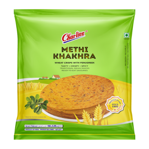 Originating from the state of Gujarat, as part of Gujarati cuisine in India, Khakhara’s are thin crackers made from wheat flour and oil. It is served usually during breakfast. khakhras are uniquely hand-made and roasted to provide a delicious, crunchy and healthy snack enjoyed with a selection of pickles and chutneys.