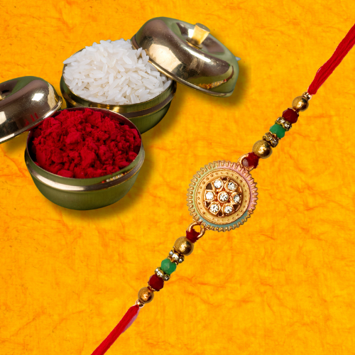 Celebrate Raksha Bandhan with a touch of royal elegance. Our Royal Medallion Rakhi is adorned with a luxurious, intricately designed medallion, set with sparkling stones that catch the light beautifully. Framed by rich, gold-toned beads and vibrant touches of green and red, this rakhi exudes sophistication and charm. The classic red thread ensures comfort and durability, making it a perfect symbol of your enduring bond. Ideal for those who appreciate a blend of traditional artistry and modern style, this rakhi promises to be a memorable part of your celebration.
